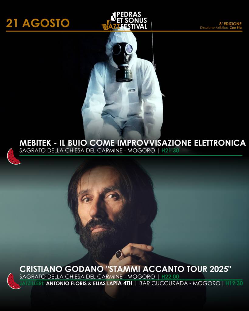 La tappa del 21 agosto a Mogoro, nella suggestiva cornice del sagrato della Chiesa della Madonna del Carmine, rappresenta uno degli appuntamenti centrali dell’ottava edizione del Pedras et Sonus Jazz Festival: un concerto pensato per ascoltatori attenti, desiderosi di emozionarsi con testi densi e suoni essenziali, in un’atmosfera intima, profonda, immersiva.