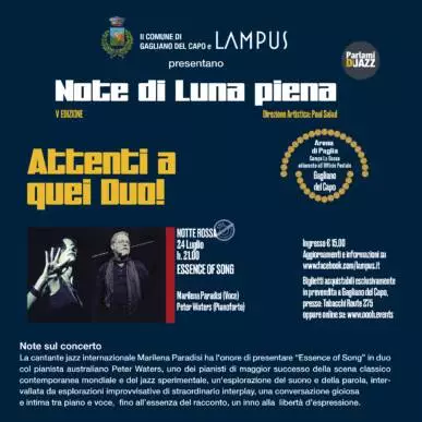 In uno scenario raro, con due semicerchi di rotoballe, a fare da arena, Marilena Paradisi e Peter Waters sul palco della seconda di tre serate di Jazz, connotata dal colore rosso: un tributo al colore intenso della terra delle campagna salentina..