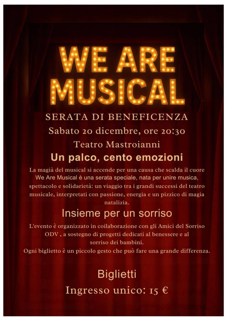 La magia del musical si accende per una causa che scalda il cuore. We Are Musical è una serata speciale, nata per unire musica, spettacolo e solidarietà: un viaggio tra i grandi successi del teatro musicale, interpretati con passione, energia💛 Insieme per un sorriso. L’evento è organizzato in collaborazione con gli Amici del Sorriso odv, a sostegno di progetti dedicati al benessere e al sorriso dei bambini. Ogni biglietto è un piccolo gesto che può fare una grande differenza.