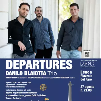 In uno scenario metafisico, tra la Basilica di Santa Maria De Finibus Terrae e il Faro di Leuca, Lampus presenta "Departures" il disco d’esordio del Danilo Blaiotta Trio, premiato in Giappone nella classifica dei migliori 10 album Jazz al mondo del 2020.