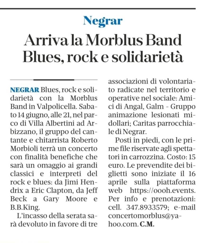 Blues e Solidarietà in Valpolicella (VR). La Morblus Band, in oltre 30 anni di storia, ha tenuto una innumerevole serie di concerti sui palchi più importanti d'Europa e degli Stati Uniti.