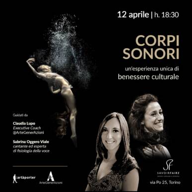 Con la guida della Executive Coach Claudia Lupo e della cantante esperta di fisiologia della voce Sabrina Oggero Viale scopriremo insieme le potenzialità dei corpi sonori, attraverso un percorso di benessere culturale che porterà consapevolezze su percezioni interne ed esterne al proprio corpo, sui cambiamenti della propria voce e delle emozioni attraverso esperienze sensoriali quali l'ascolto, il movimento, una degustazione e le note profumate di una fragranza.
