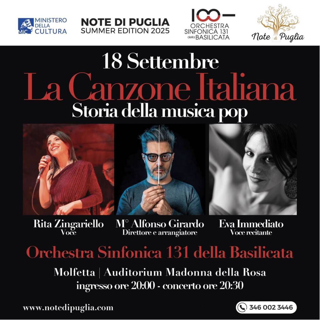 Le canzoni che hanno fatto la storia rivivono in una serata unica: “La canzone italiana”. Molfetta, 18 settembre. Orchestra 131, Rita Zingariello ed Eva Immediato, diretti da Alfonso Girardo.