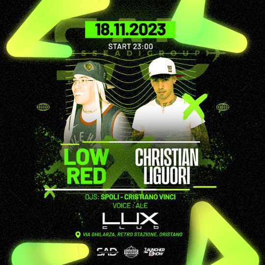 Sabato 18/11/23 al Lux Club di Oristano si esibiranno il cantante Low Red e il dj Christian Liguori