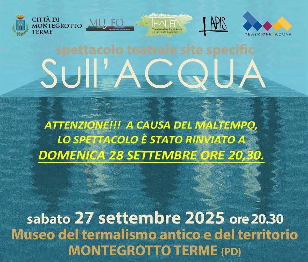 "Sull'Acqua" è uno spettacolo teatrale site-specific ideato appositamente per il Museo del Termalismo antico e del Territorio di Montegrotto Terme. In scena quattro personaggi, diversi tra loro, che incarnano emozioni, pensieri e visioni spesso contrastanti. Ognuno diventa un prisma attraverso cui osservare e riflettere sul tema portante dello spettacolo: l’acqua, nelle sue infinite valenze. Con uno stile grottesco i personaggi indagano contraddizioni, tensioni, slanci poetici e momenti di crudezza, mantenendo viva l’attenzione e aprendo spiragli di riflessione che lo spettatore può fare propri in modo personale e non dogmatico.