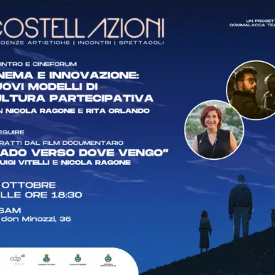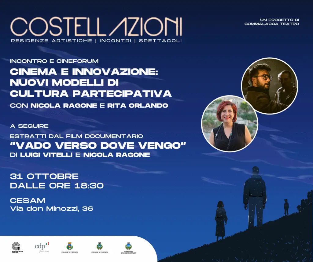 All'interno del progetto Costellazioni, ideato e realizzato da Gommalacca Teatro e sostenuto dalla Fondazione CDP, un talk su cinema e cultura partecipativa con Rita Orlando (Direttrice Fondazione Matera-Basilicata 2019) e Nicola Ragone (film-maker).