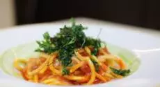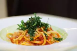Tonnarello con "Pomodoro del Piennolo", salsa alle erbe e mozzarella affumicata “Tonnarello pasta with tomato of " Piennolo " , herb's sauce and smoked mozzarella