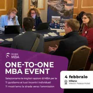 Approfitta delle opportunità globali con un MBA riconosciuto a livello internazionale. Partecipa all'evento Access MBA a Milano il 4 febbraio 2025. Durante il nostro esclusivo aperitivo milanese, incontrerai ex-alumni e leader del settore per ampliare la tua rete professionale e esplorare nuove prospettive di carriera.