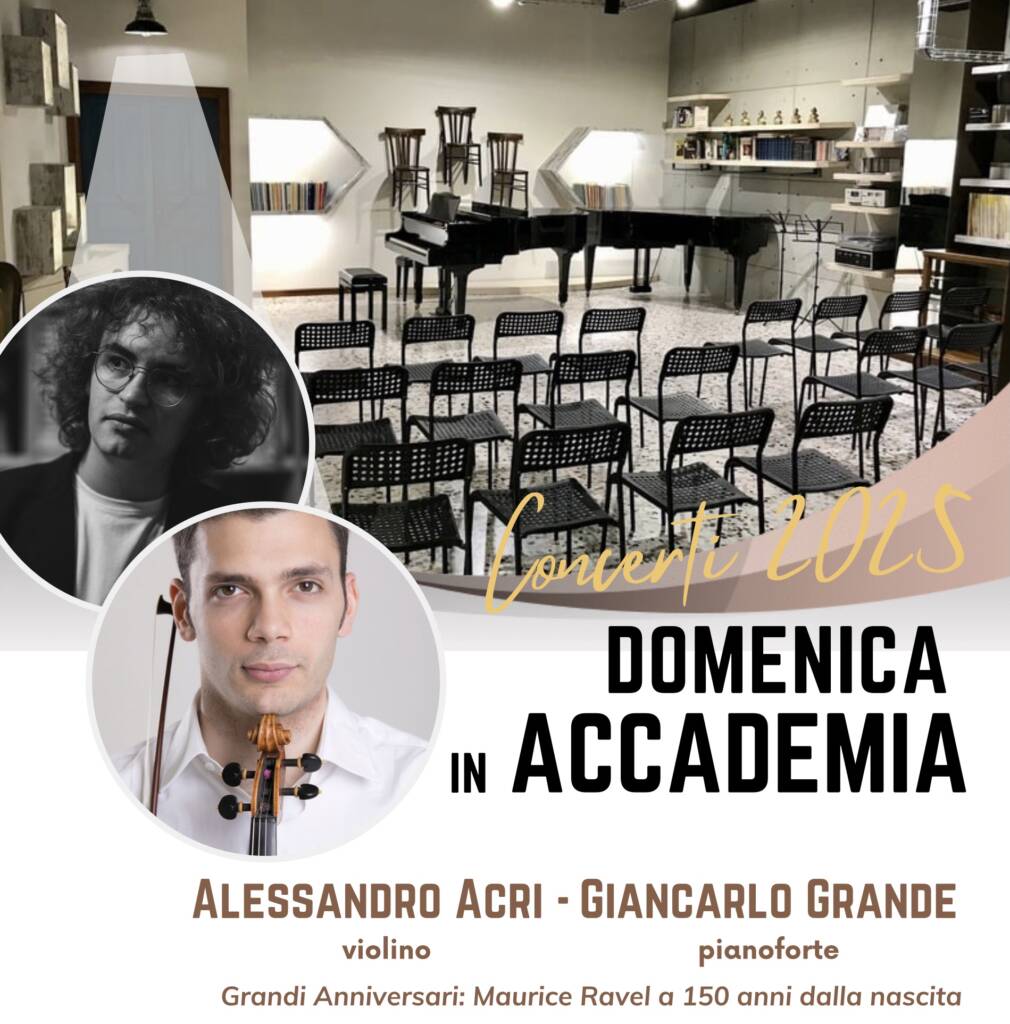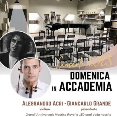 Un omaggio a Ravel nel 150° anniversario della nascita con la Sonata “Posthume” per violino e pianoforte proposta dal duo Alessandro Acri - Giancarlo Grande. In programma anche la celeberrima Sonata “a Kreutzer” di Beethoven.