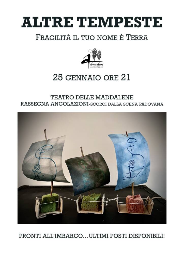 L'azione unisce ricerca teatrale e impegno ambientalista e, dalla Tempesta shakespeariana, affiorano racconti di altre tempeste, altre storie, altri disastri e altri luoghi fragili...