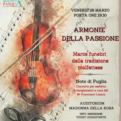 Un viaggio musicale nella tradizione delle processioni molfettesi: Armonie della Passione ripropone le suggestive melodie della Settimana Santa, trascritte per orchestra da camera, mantenendo intatta l'intensità emotiva di una tradizione profondamente radicata nella nostra comunità.