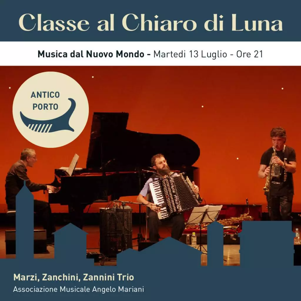 Martedì 13 Luglio la grande musica arriva a Classe al Chiaro di Luna con Musica dal Nuovo Mondo: Astor Piazzolla 1921 - 2021. Per l’occasione saranno sul palco Marzi/Zanchini/Zannini Trio.