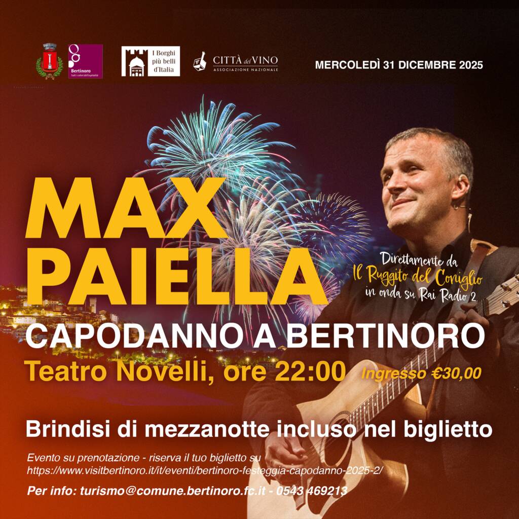 Bertinoro celebra l'ultimo giorno dell'anno con Max Paiella, artista fisso del cast di "Il Ruggito del Coniglio", il noto programma radiofonico in onda su Rai Radio 2, che propone "IL BOOM DI CAPODANNO".