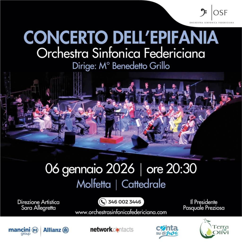 Ritorna il tradizionale 𝐂𝐨𝐧𝐜𝐞𝐫𝐭𝐨 𝐝𝐞𝐥𝐥’𝐄𝐩𝐢𝐟𝐚𝐧𝐢𝐚, 𝑎𝑝𝑝𝑢𝑛𝑡𝑎𝑚𝑒𝑛𝑡𝑜 𝑜𝑟𝑚𝑎𝑖 𝑐𝑜𝑛𝑠𝑜𝑙𝑖𝑑𝑎𝑡𝑜 𝑛𝑒𝑙 𝑝𝑎𝑛𝑜𝑟𝑎𝑚𝑎 𝑐𝑢𝑙𝑡𝑢𝑟𝑎𝑙𝑒 𝑑𝑒𝑙𝑙𝑎 𝑐𝑖𝑡𝑡𝑎̀ 𝑑𝑖 𝑀𝑜𝑙𝑓𝑒𝑡𝑡𝑎 con l’ 𝐎𝐫𝐜𝐡𝐞𝐬𝐭𝐫𝐚 𝐒𝐢𝐧𝐟𝐨𝐧𝐢𝐜𝐚 𝐅𝐞𝐝𝐞𝐫𝐢𝐜𝐢𝐚𝐧𝐚 per concludere insieme ed in musica le festività natalizie.