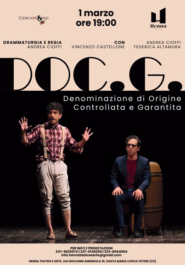 D.O.C.G. è il racconto teatrale di due giovani imprenditori vinicoli, dal ritmo incalzante, con una comicità energia e uno sguardo poetico, ricordandoci che spesso, nel gioco tra l'essere e l'apparire, a restare inebriata è proprio la nostra verità.
