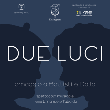 Due icone, due geni, due “Luci” che hanno illuminato la musica italiana. Con “Due Luci”, la compagnia DeSinghers vi invita a un viaggio nel tempo attraverso le emozioni che solo la musica di Battisti e Dalla sa suscitare: la gioia contagiosa dei ritmi incalzanti, la malinconia struggente delle ballate più intime, la passione impetuosa dei testi più intensi, la nostalgia avvolgente dei ricordi legati alle loro canzoni.