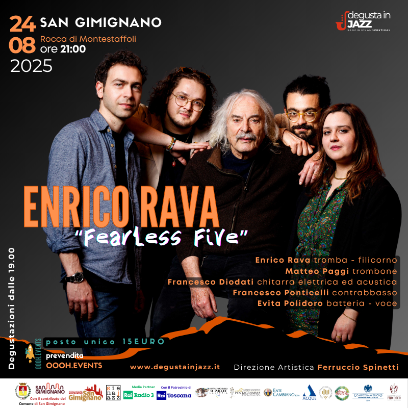 Fearless Five è il nuovo progetto di Enrico Rava, un quintetto "senza paura" composto da una nuova generazione di musicisti, che mette insieme energie giovani e creative, insieme all’enorme esperienza del band leader. La storica rivista Musica Jazz, in occasione dell’annuale referendum del Top Jazz, ha assegnato a F earless Five il premio per il 2024 come "Disco dell’anno" e “Formazione dell’anno". Ancora una volta, Rava è riuscito a dare vita a una formazione fresca ed eccitante.