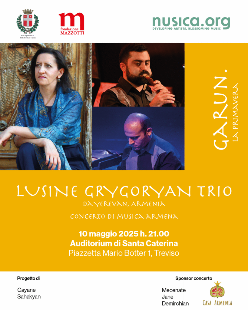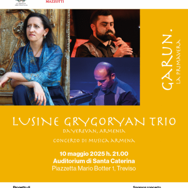 In chiusura della rassegna, il 10 maggio alle 21 all’auditorium di Santa Caterina a Treviso, si terrà il concerto di musica armena del Lusine Grigoryan Trio, capitanato dalla pianista Lusine Grigoryan e completato da Norayr Gapoyan, duduk, e Vladimir Papikyan, santur e voce.