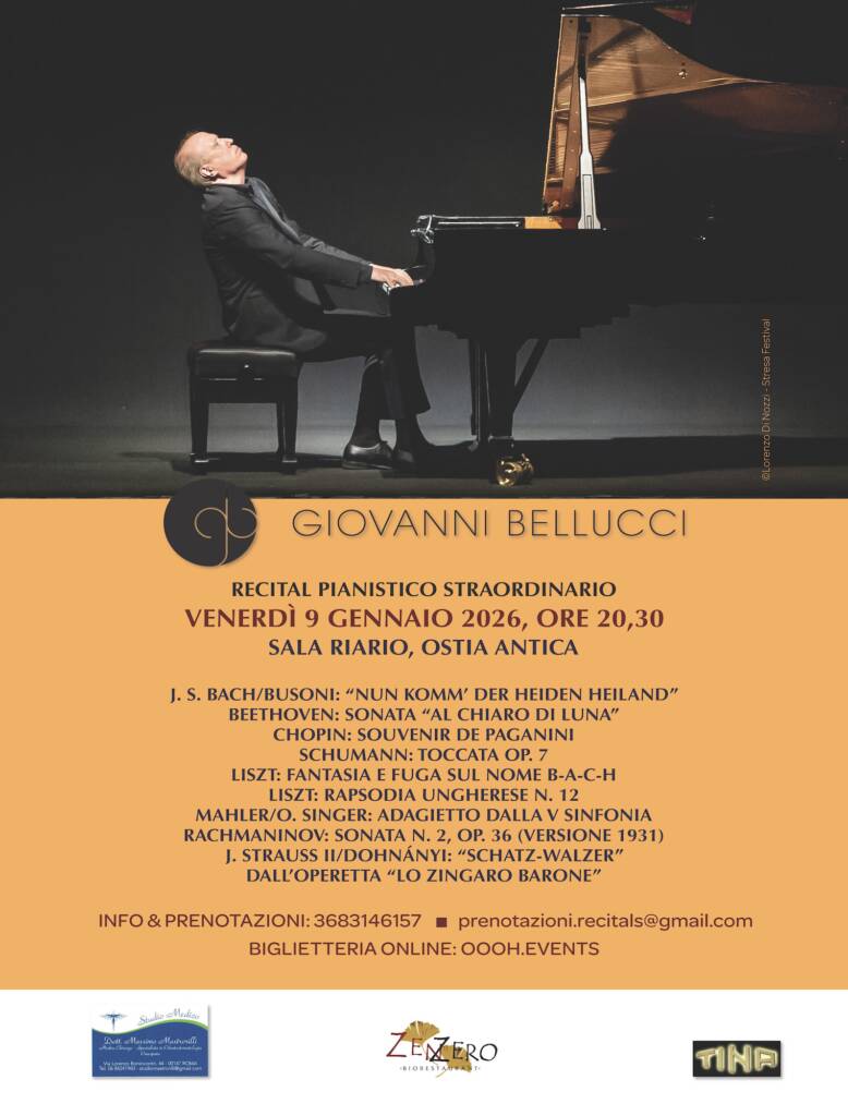 Inserito dal magazine francese Diapason nella Top Ten degli interpreti lisztiani della storia (accanto ai gloriosi nomi di Argerich, Arrau, Brendel, Ciccolini, Cziffra, Zimerman), Giovanni Bellucci sarà in concerto venerdi 9 gennaio 2026 (alle ore 20,30) nella splendida atmosfera dalla Sala Riario Episcopio di Ostia Antica.