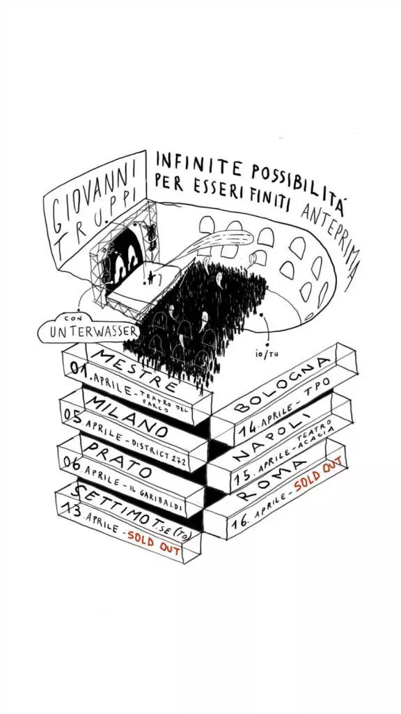 Non un concerto classico ma un vero viaggio inedito nel nuovo disco che vedrà Giovanni Truppi affiancato dal sodale Marco Buccelli. Un’occasione irripetibile per ascoltare un live totalmente rinnovato, dalla veste sonora inaspettata, in dialogo con il raffinato teatro d’ombre di Unterwasser, compagnia al femminile che indaga le reciproche contaminazioni tra il teatro di figura e le arti visive, vincitrice del Premio della Critica 2022 dell’ANCT (Associazione Nazionale dei Critici di Teatro) e che ha presentato i propri lavori in tutto il mondo e nei più prestigiosi festival italiani da la Biennale Teatro di Venezia al Romaeuropa Festival.