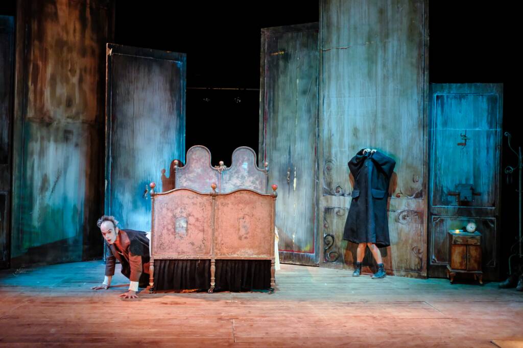 L’ingresso allo spettacolo avviene attraverso il palco, dove le porte della scenografia mobile sono disposte a creare un labirintico corridoio che il pubblico attraversa per andare a sedersi al proprio posto, scardinando l’orientamento e l’abitudine, e rappresentando i percorsi complessi e ritorti che il pensiero di una mente inquieta disegna.