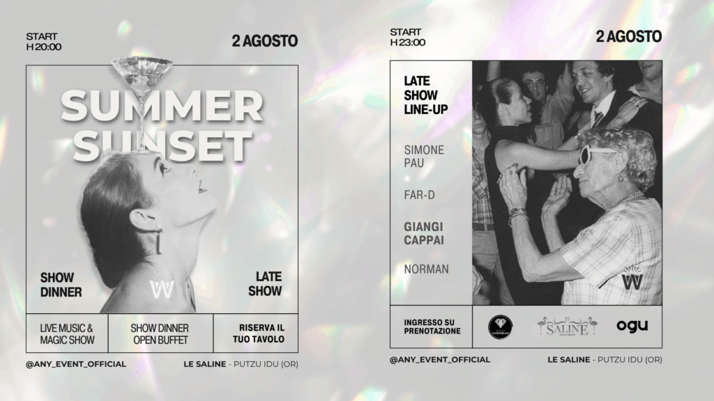 Con il calar della notte, si aprirà il Late Show: con un dj set appassionante. 🎶 Simone Pau, Far-D, Giangi Cappai e Norman vi guideranno tra sonorità house e tech-house raffinate, per farvi ballare e vivere una notte ancora più magica. ✨
