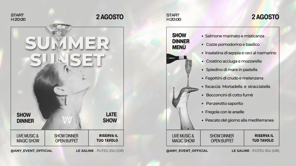 Lo Show Dinner si aprirà con un drink di benvenuto ed un vario buffet di piatti ispirati alla tradizione mediterranea, freschi e genuini, pensati per esaltare i sapori dell’estate. 🥂 La cena sarà accompagnata da meravigliosa musica dal vivo e da un ospite speciale 🪄, per un’esperienza a 360°.