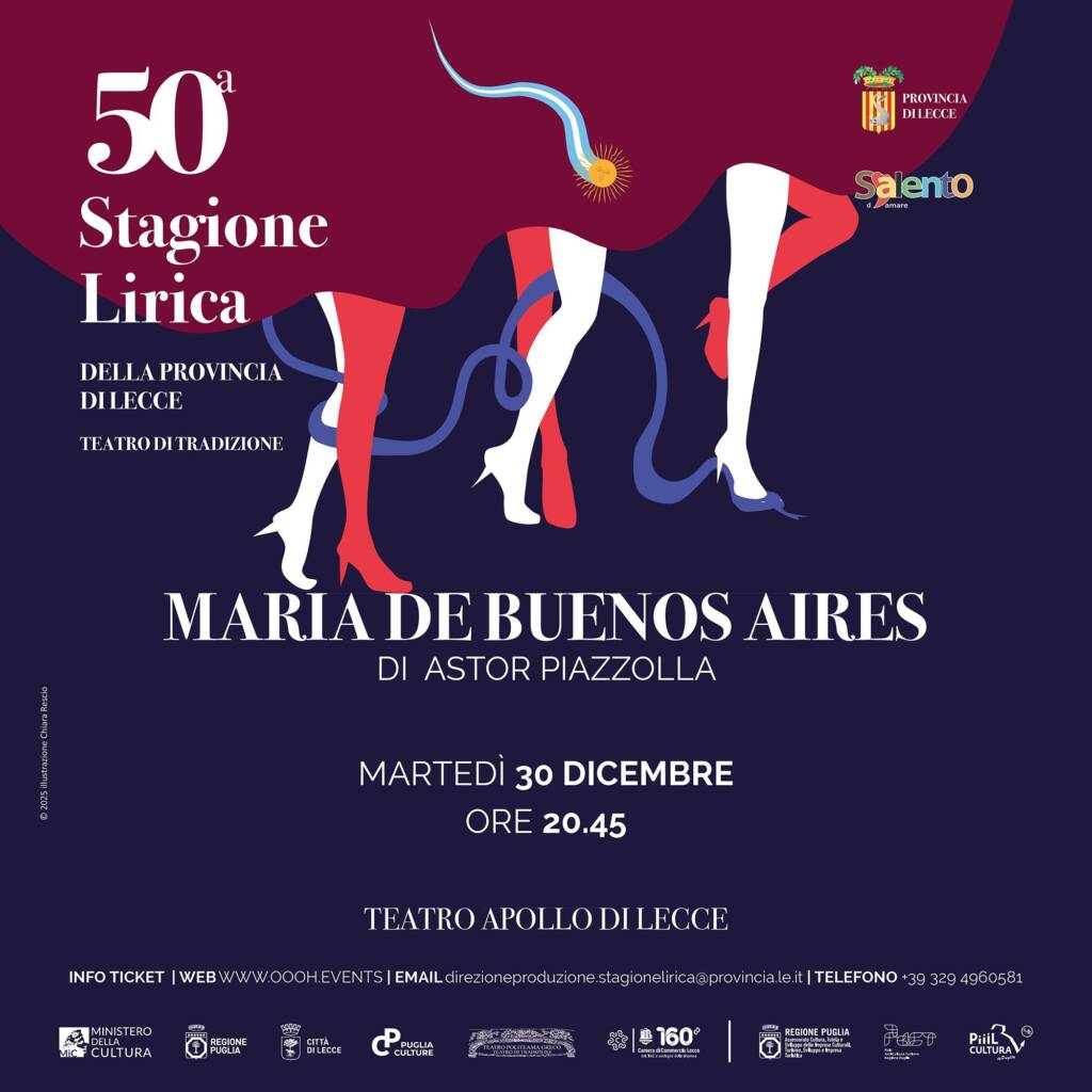 L’opera tango Maria de Buenos Aires di Astor Piazzolla andrà in scena al Teatro Apollo martedì 30 dicembre alle 20.45 a chiusura della cinquantesima Stagione Lirica della Provincia di Lecce - Teatro di Tradizione sotto la direzione artistica di Giandomenico Vaccari e Maurilio Manca.