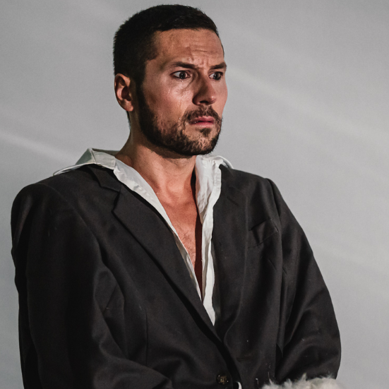 Larva, Blatta e Sapiens sono tre figure e tre cornici. La prima figura nasce in una situazione pubblica, in un contesto da evento politico. Vengono evocati sulla scena i grandi temi, dalla crisi della democrazia all’emergenza climatica, dalla guerra alla gravità della situazione mondiale che progressivamente vanno a disegnare il perimetro della catastrofe. In tale recinto Larva fa la sua parte da operetta, scintilla di superficie, ammicca a se stessa. Nell’assenza di pensiero, il godimento immediato di un bello codificato finisce per disperdere ogni contenuto, produce spaesamento, rivela inettitudine. Il corpo diviene il luogo di ogni perdita, si fa ostacolo, si lacera, si disfa e si sottrae alla forma umana. Da questa nuova condizione lancia il suo manifesto politico. Farsa e tragedia si fondono.