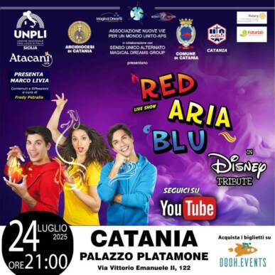 Uno spettacolo straordinario, ricco di contenuti e messaggi positivi, pensato per famiglie e spettatori di tutte le età, che trasporterà il pubblico nel fantastico mondo Disney attraverso le più belle e celebri canzoni dei classici film e cartoni animati, amati da tutte le generazioni. Red Aria e Blu sono tre talentuosi youtuber: i gemelli Umberto e Daniele Vita e Giuliana Di Dio. Con oltre 36 milioni di visualizzazioni sul loro canale YouTube, sono noti per la loro energia e il loro talento artistico. Ma non sarà solo uno spettacolo divertente ma un modo per comunicare ai bambini e alle famiglie come difendersi dal bullismo, dalle dipendenze da internet e promuovere il dialogo e i rapporti all’interno delle famiglie tra genitori e figli.