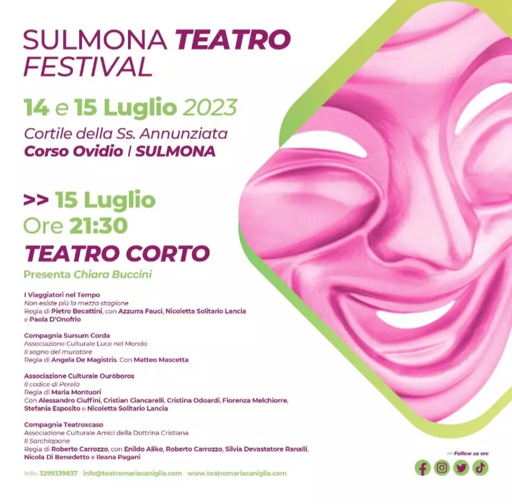 Sarà nel cortile del complesso della SS. Annunziata situato lungo corso Ovidio a Sulmona che i prossimi 14 e 15 luglio alle ore 21:00 prenderà il via la terza edizione del Sulmona Teatro Festival promossa ed organizzata da Meta Aps nell'ambito del movimento culturale Caniglia in Rete inserito all'interno del progetto “Teatro Maria Caniglia – Teatro di Produzione” .